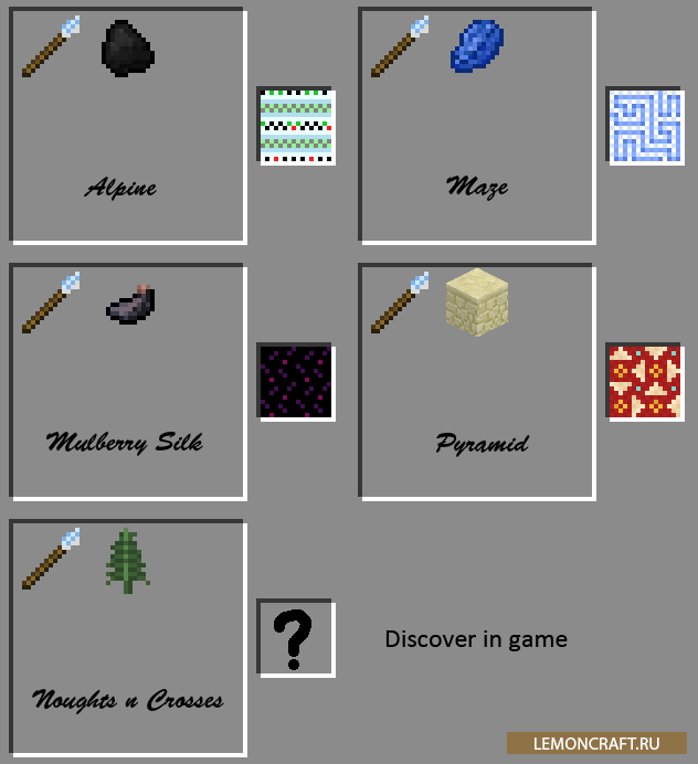 Мод Dooglamoo Painter добавляет возможность рисовать различные узоры на предметах с помощью специальных кистей и узорных блоков. Все узоры можно скрафтить из подручных средств. Теперь можно разукрасить свой дом, придав ему индивидуальность, что будет радовать глаз и украшать саму игру.
